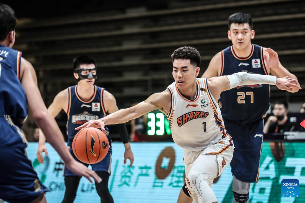 Li Tianrong (R) of Shanghai Sharks goes to basket during the 29th round match between Shanghai Sharks and Nanjing Monkey Kings at the 2021-2022 season of the Chinese Basketball Association (CBA) league in Shenyang, capital of northeast China's Liaoning Province, on March 1, 2022. (Xinhua/Pan Yulong)
