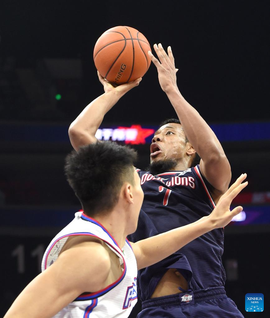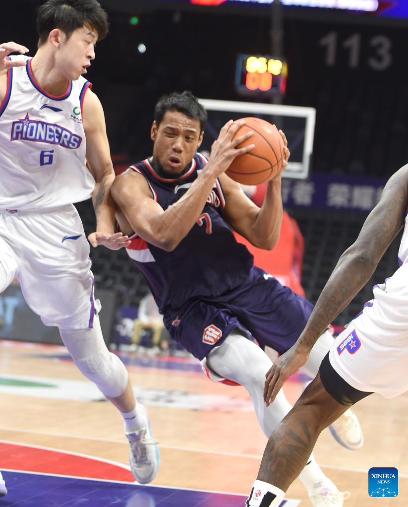 Taylor Rochestie (C) of Tianjin Pioneers competes during the 29th round match between Guangzhou Loong Lions and Tianjin Pioneers at the 2021-2022 season of the Chinese Basketball Association (CBA) league in Foshan of south China's Guangdong Province, on March 1, 2022. (Xinhua/Lu Hanxin)
