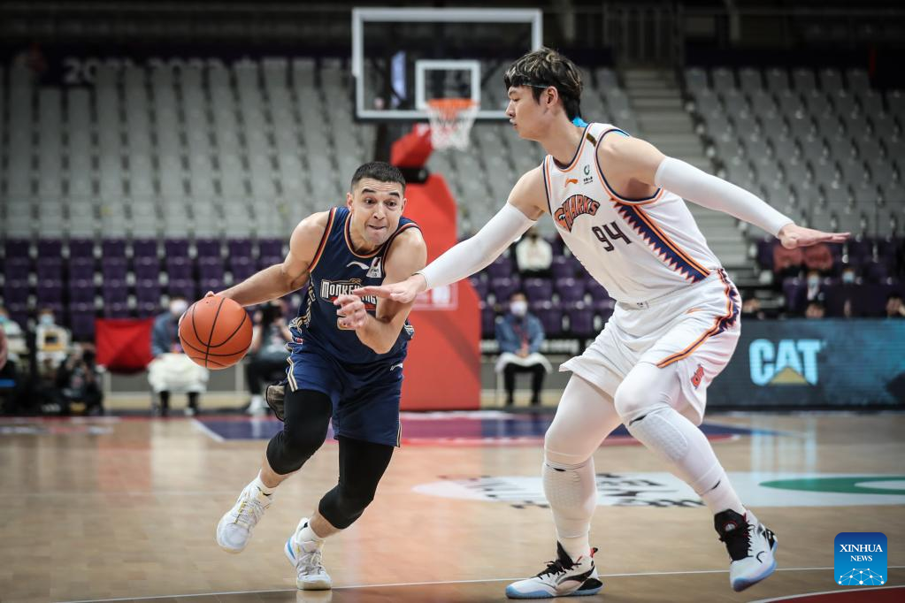 D'Montre Edwards (L) of Nanjing Monkey Kings competes during the 29th round match between Shanghai Sharks and Nanjing Monkey Kings at the 2021-2022 season of the Chinese Basketball Association (CBA) league in Shenyang, capital of northeast China's Liaoning Province, on March 1, 2022. (Xinhua/Pan Yulong)