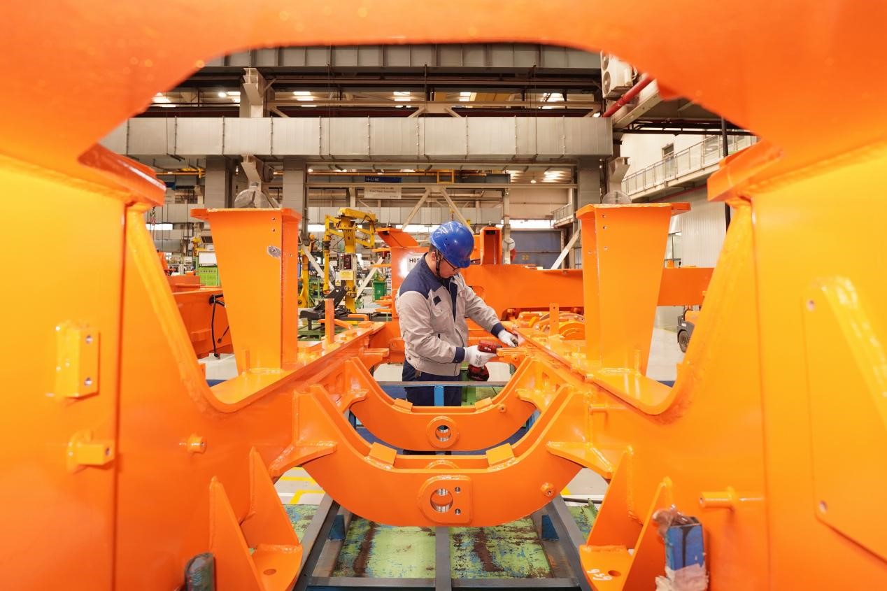A worker is busy with production at a factory of Hyundai Doosan Infracore in Yantai city, east China’s Shandong province, Feb. 7, 2022. (People’s Daily Online/Tang Ke)