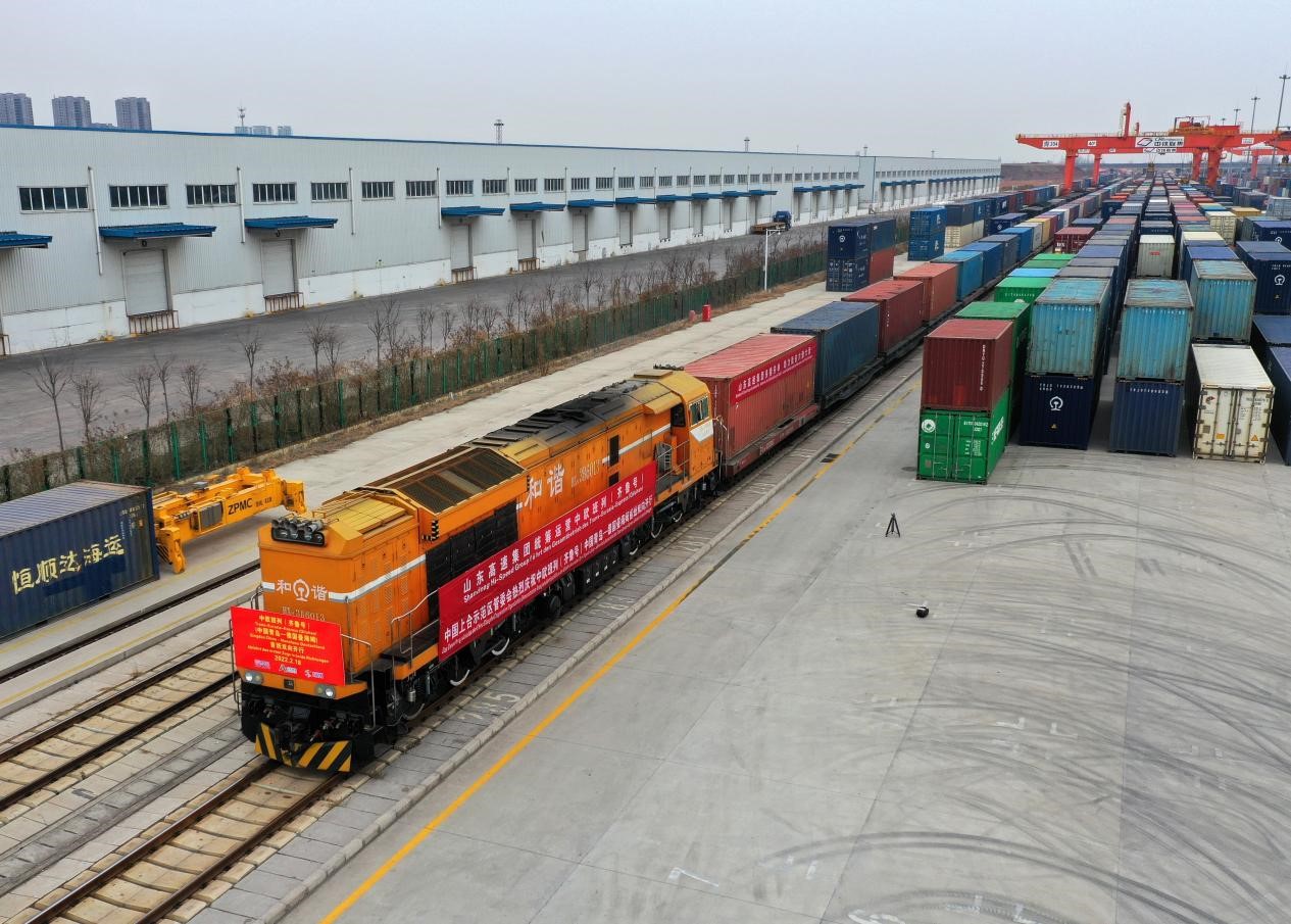A China-Europe freight train loaded with 100 twenty-foot equivalent units of different types of goods, including chemical raw materials, vehicle accessories, and daily necessities, leaves a multimodal transportation center at China-SCO Local Economic and Trade Cooperation Demonstration Zone in Jiaozhou city, east China’s Shandong province, for Mannheim, Germany, Feb. 18, 2022. (People’s Daily Online/Wang Zhaomai)