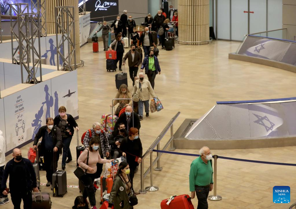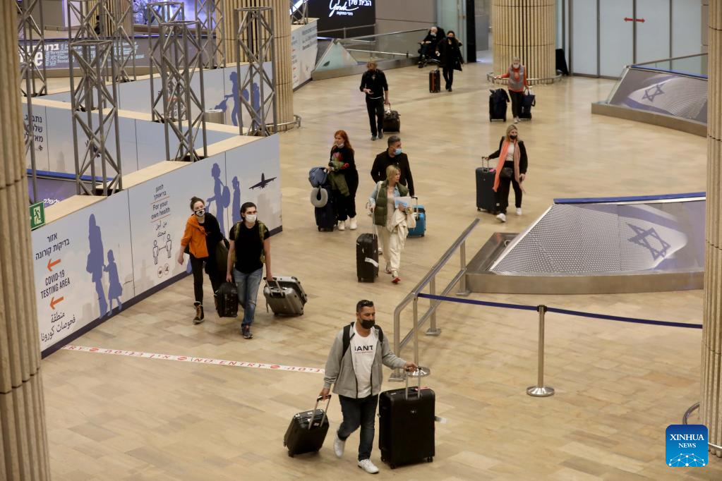 Passengers walk with their luggage as they arrive at Ben Gurion Airport near Tel Aviv, Israel, on March 1, 2022. Israel on Tuesday opened its borders to foreign tourists who were not vaccinated against COVID-19, said a statement issued by Israel's Ministry of Health. (Photo by Gil Cohen Magen/Xinhua)