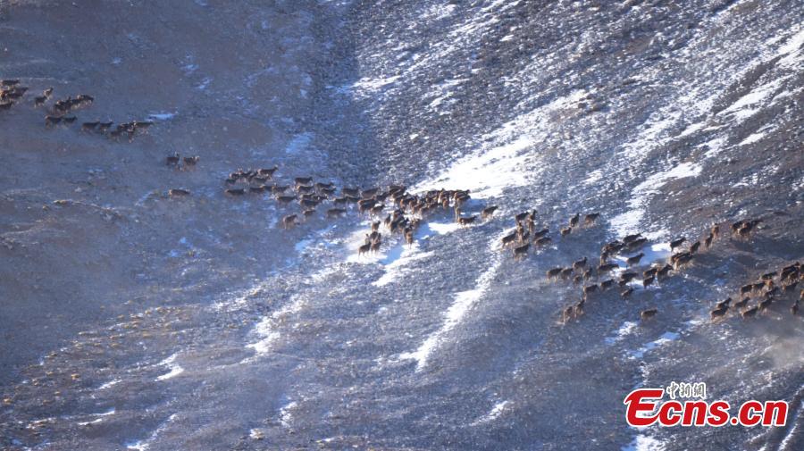 About 160 white-lipped deer, also known as Thorold's deer, have been spotted in the Qilian Mountains National Park in northwest China's Gansu Province. (Photo: China News Service/Wu Xuefeng)