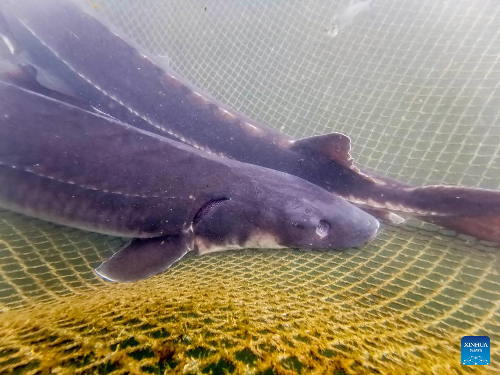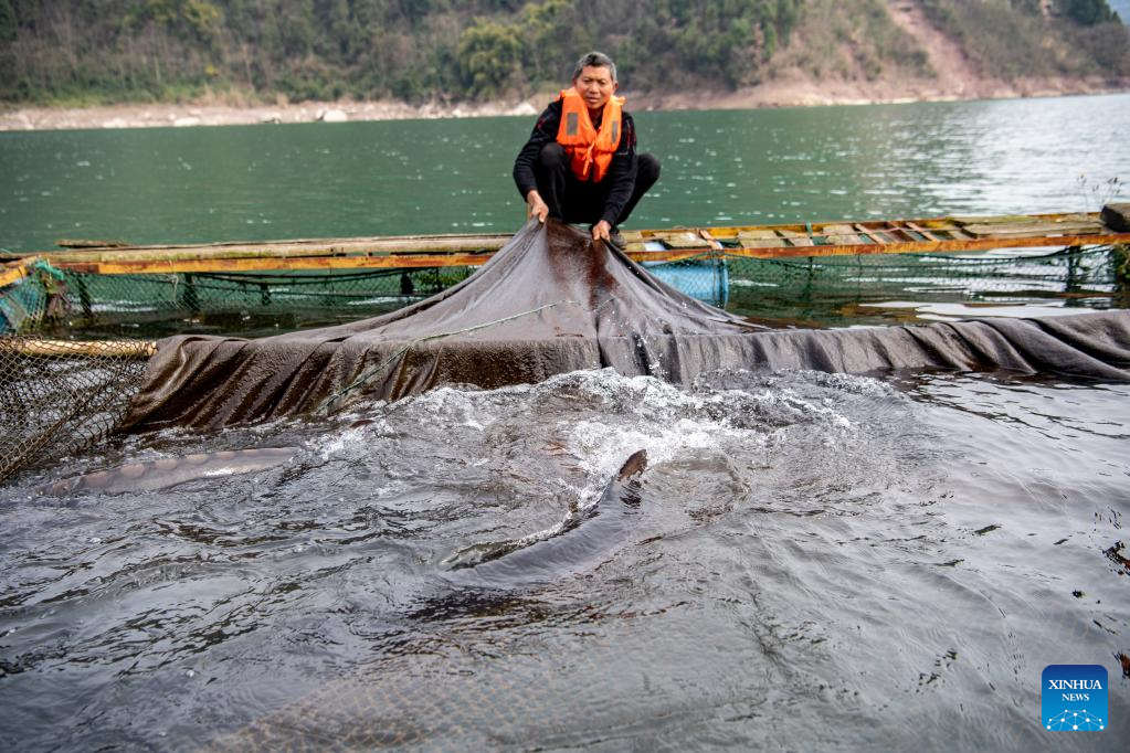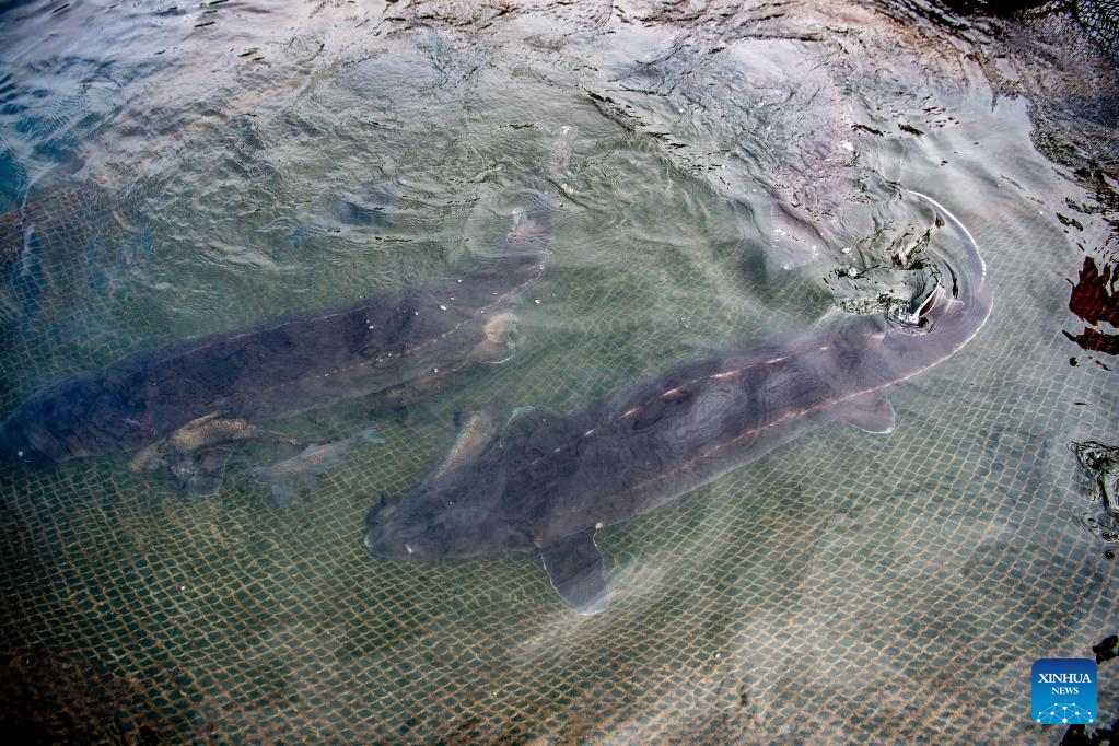 A staff member checks the growing situation of the Yangtze sturgeons at a breeding base for rare fishes in the Three Gorges Reservoir in southwest China's Chongqing, Feb. 25, 2022.