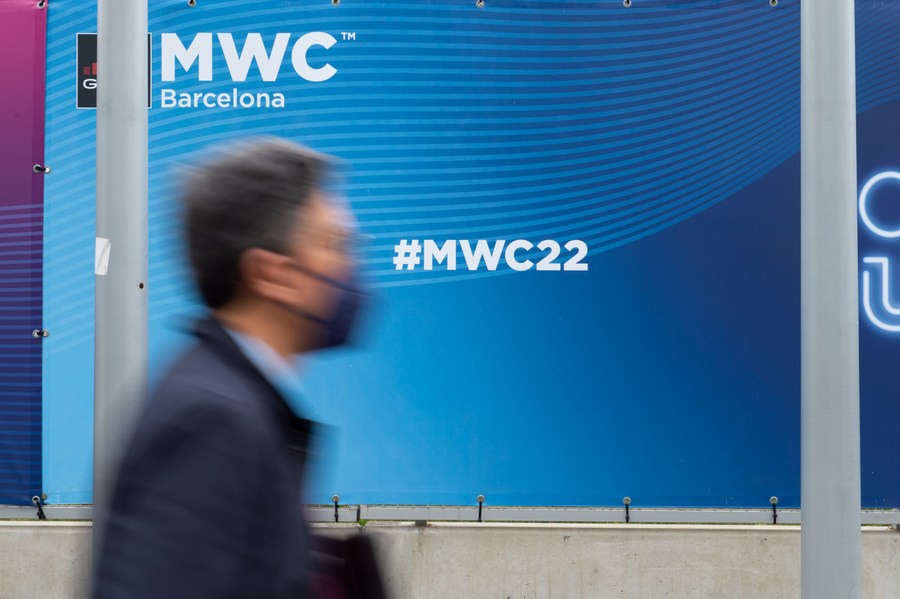 A visitor is seen at the Mobile World Congress (MWC) in Barcelona, Spain, March 2, 2022. (Photo by Gustavo Valiente/Xinhua)