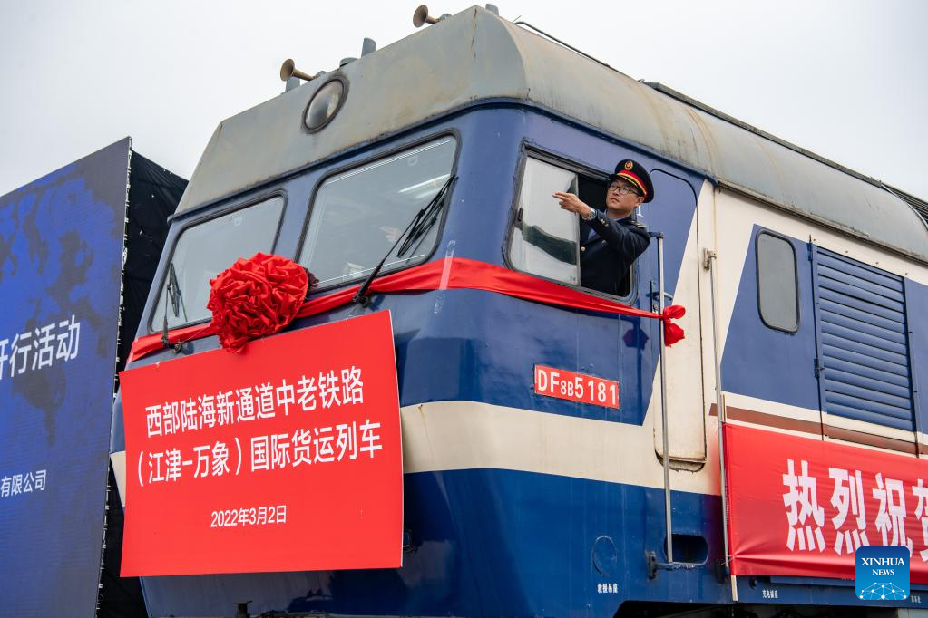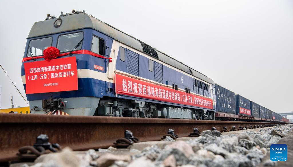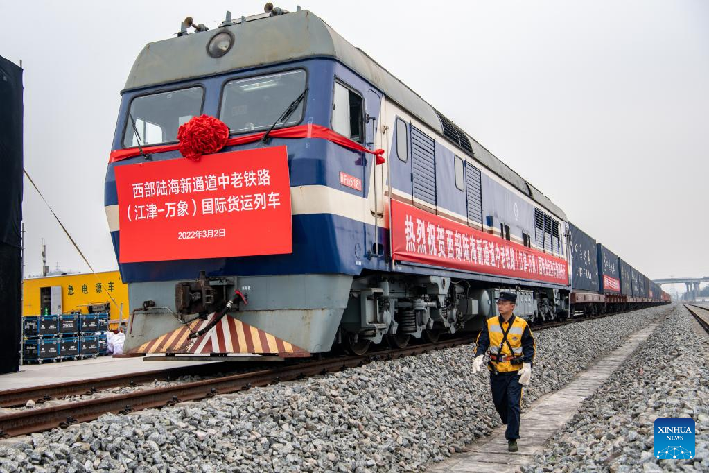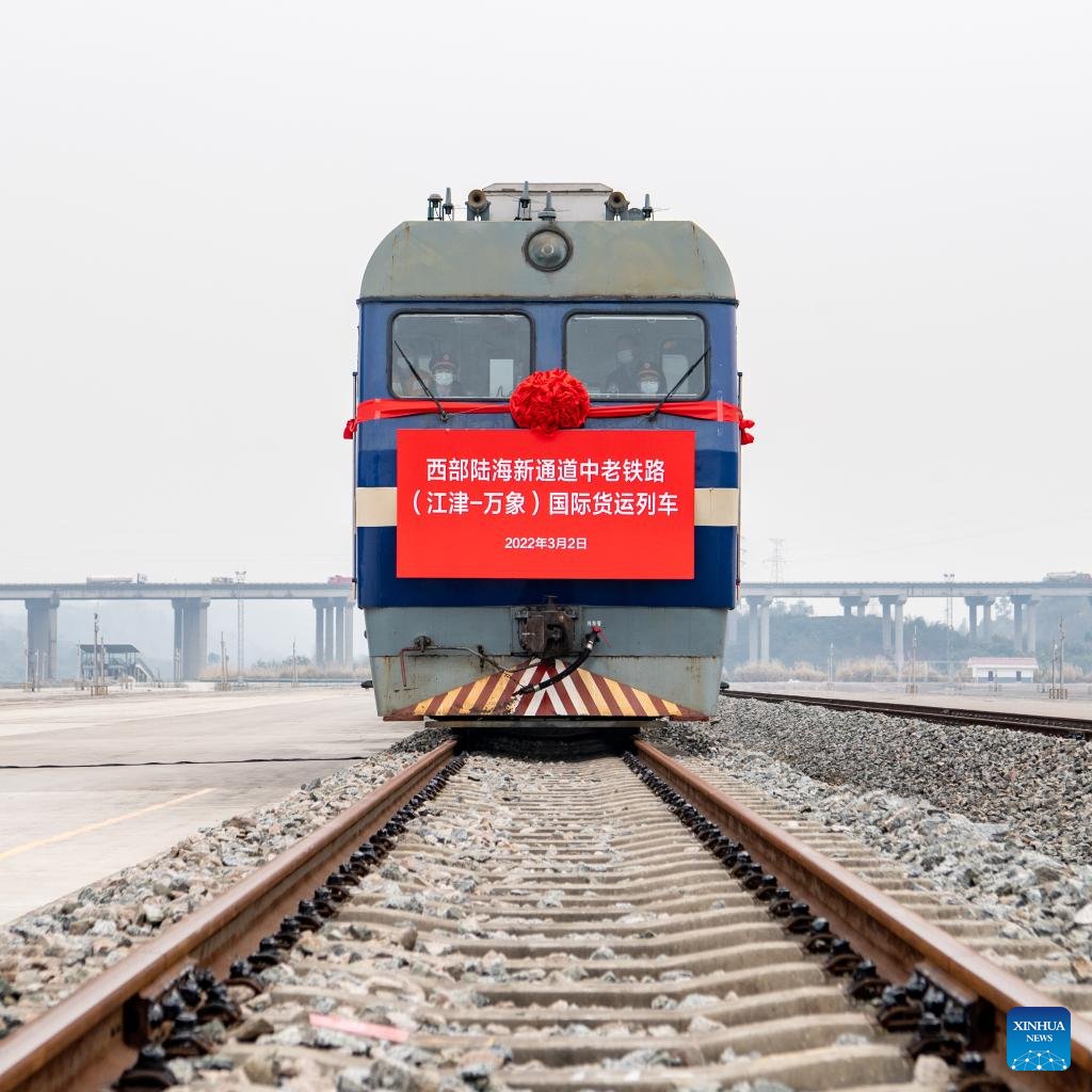 A cargo train bound for Vientiane, Laos, departs from Xiaonanya station in Jiangjin District, southwest China's Chongqing Municipality, March 2, 2022. (Xinhua/Tang Yi)