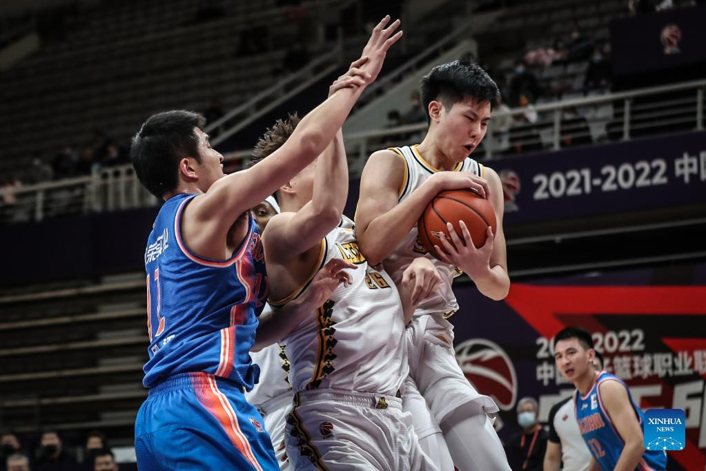 Zhao Jiayi (R) of Zhejiang Lions vies for a rebound during the 29th round match between Zhejiang Lions and Sichuan Blue Whales at the 2021-2022 season of the Chinese Basketball Association (CBA) league in Shenyang of northeast China's Liaoning Province, on March 2, 2022. (Xinhua/Pan Yulong)