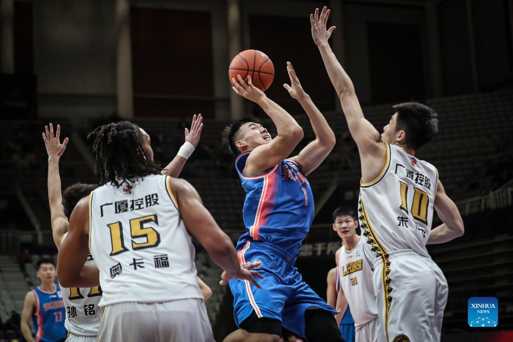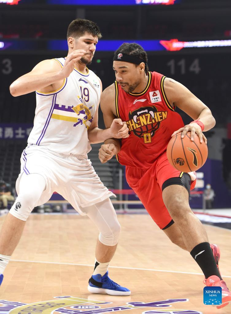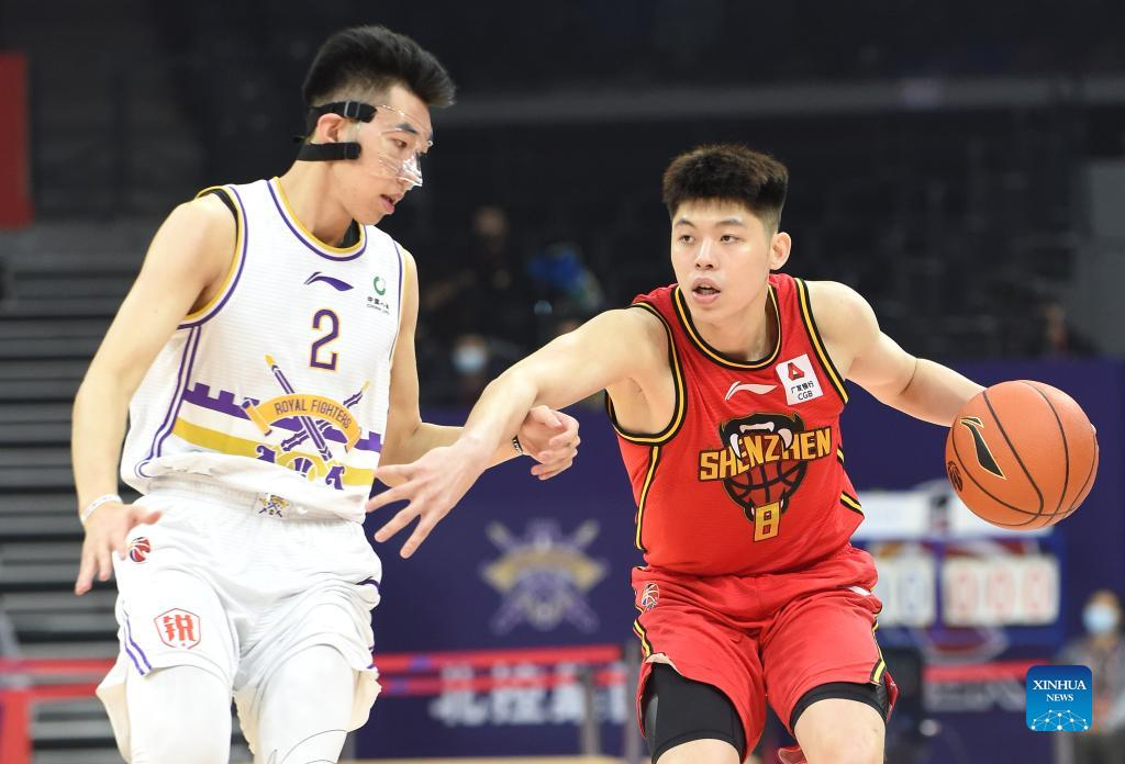 Rong Zifeng (R) of Shenzhen Leopards competes during the 29th round match between Beijing Royal Fighters and Shenzhen Leopards at the 2021-2022 season of the Chinese Basketball Association (CBA) league in Foshan of south China's Guangdong Province, March 2, 2022. (Xinhua/Lu Hanxin)