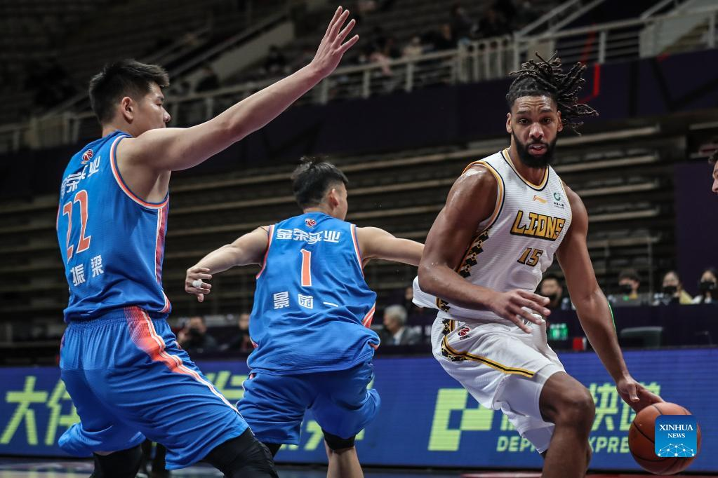 Jahlil Okafor (R) of Zhejiang Lions competes during the 29th round match between Zhejiang Lions and Sichuan Blue Whales at the 2021-2022 season of the Chinese Basketball Association (CBA) league in Shenyang of northeast China's Liaoning Province, on March 2, 2022. (Xinhua/Pan Yulong)