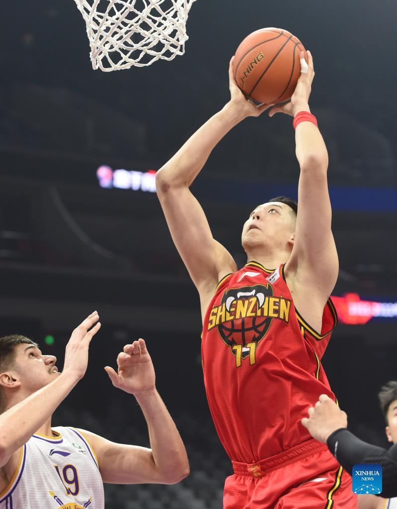 Shen Zijie (R) of Shenzhen Leopards goes for a lay-up during the 29th round match between Beijing Royal Fighters and Shenzhen Leopards at the 2021-2022 season of the Chinese Basketball Association (CBA) league in Foshan of south China's Guangdong Province, March 2, 2022. (Xinhua/Lu Hanxin)