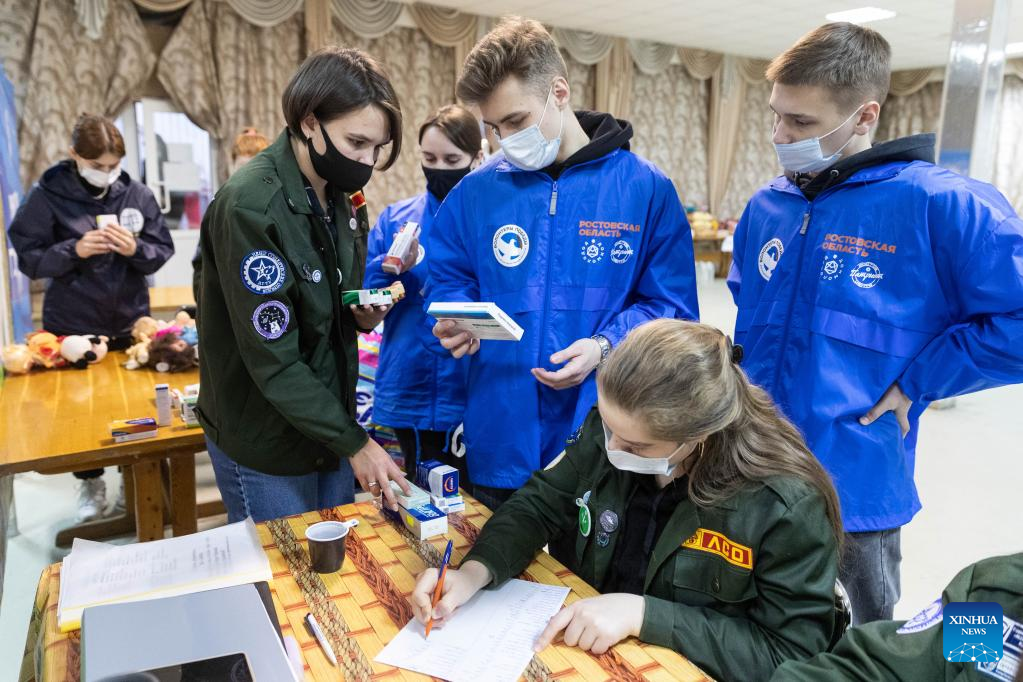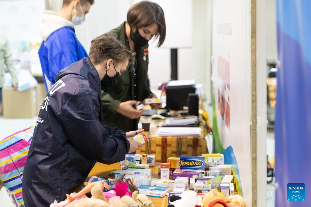 Volunteers arrange medicines donated by local residents for people from Donbass in a university in Rostov-on-Don, Russia, March 2, 2022. (Xinhua/Bai Xueqi)