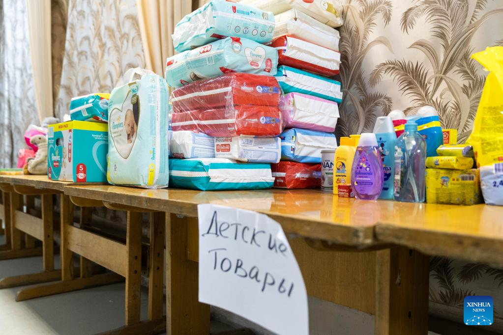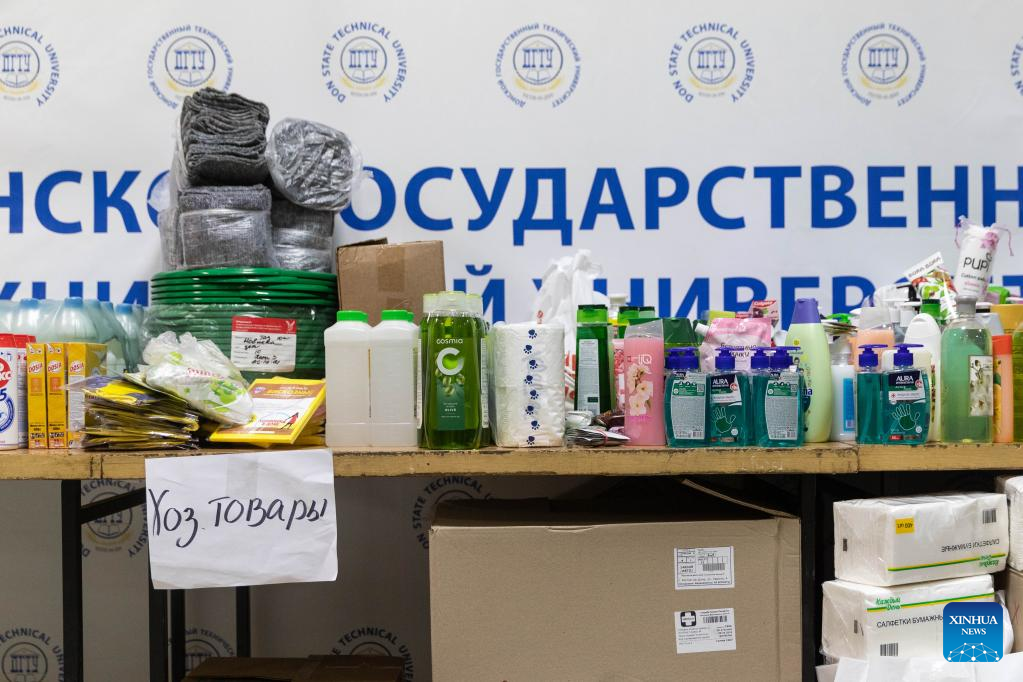 Photo taken on March 2, 2022 shows supplies donated by local residents for people from Donbass in a university in Rostov-on-Don, Russia. (Xinhua/Bai Xueqi)
