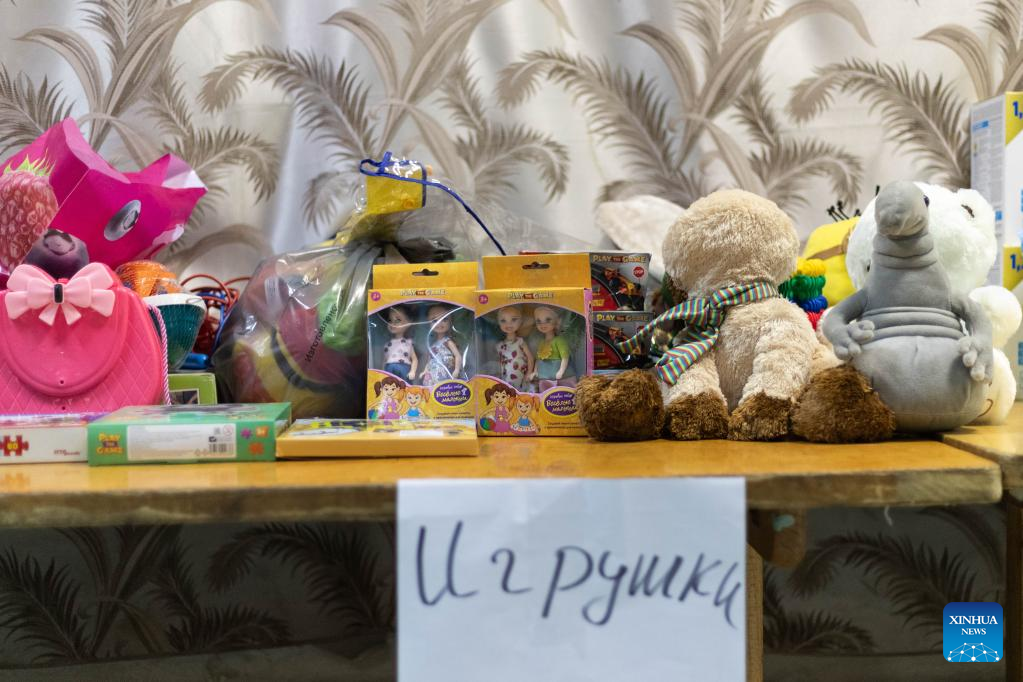 Photo taken on March 2, 2022 shows toys donated by local residents for people from Donbass in a university in Rostov-on-Don, Russia. (Xinhua/Bai Xueqi)