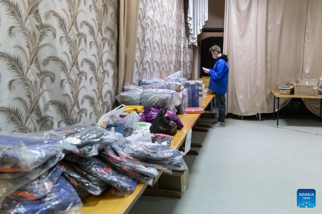 A volunteer arranges supplies donated by local residents for people from Donbass in a university in Rostov-on-Don, Russia, March 2, 2022. (Xinhua/Bai Xueqi)