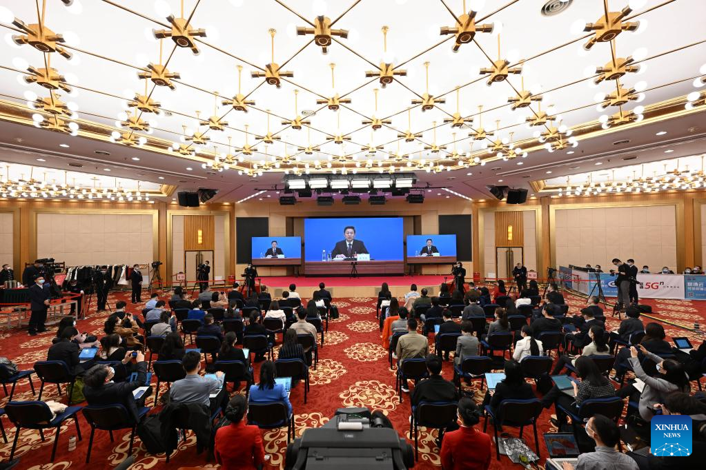 Guo Weimin, spokesperson for the fifth session of the 13th National Committee of the Chinese People's Political Consultative Conference (CPPCC), briefs media on the session and takes questions via video link due to COVID-19 prevention and control requirements during a press conference in Beijing, capital of China, March 3, 2022. (Xinhua/Jin Liangkuai)