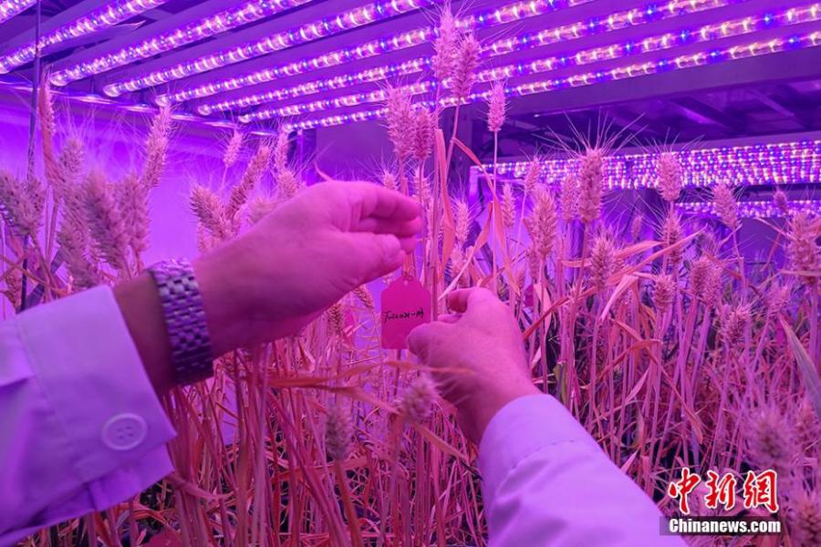 Photo shows a technician examining wheat plant in a lab of the Pingliang Academy of Agricultural Sciences in Gansu. (Photo: China News Service/Li Weixuan)