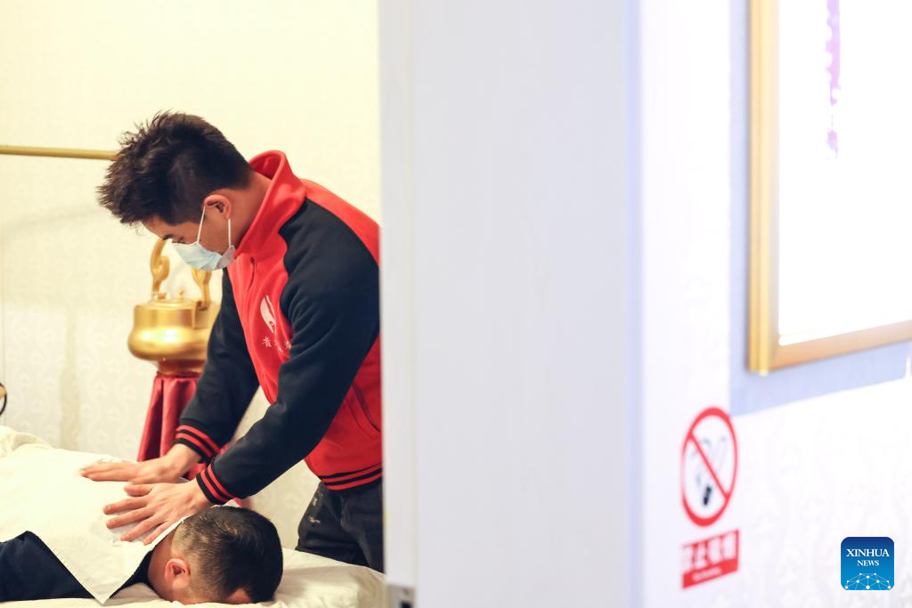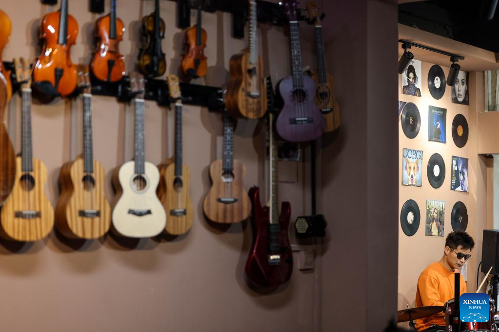 Drummer Chen Changhai works at a massage parlor in Guiyang, southwest China's Guizhou Province, March 1, 2022. A band named "Fish Mint" consists of three massage therapists and a delivery man who were all born in the 1990s. Yet the delivery man is the only one who could see while the rest are with visual impairment.