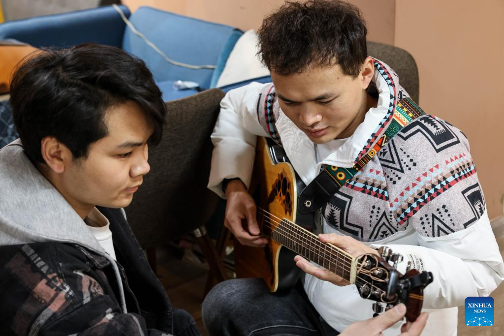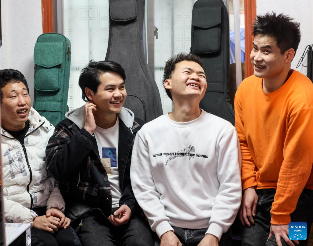 Bassist Peng Wanhai (L) helps guitarist Yang Zhi tune his guitar in Guiyang, southwest China's Guizhou Province, March 1, 2022. A band named "Fish Mint" consists of three massage therapists and a delivery man who were all born in the 1990s. Yet the delivery man is the only one who could see while the rest are with visual impairment.