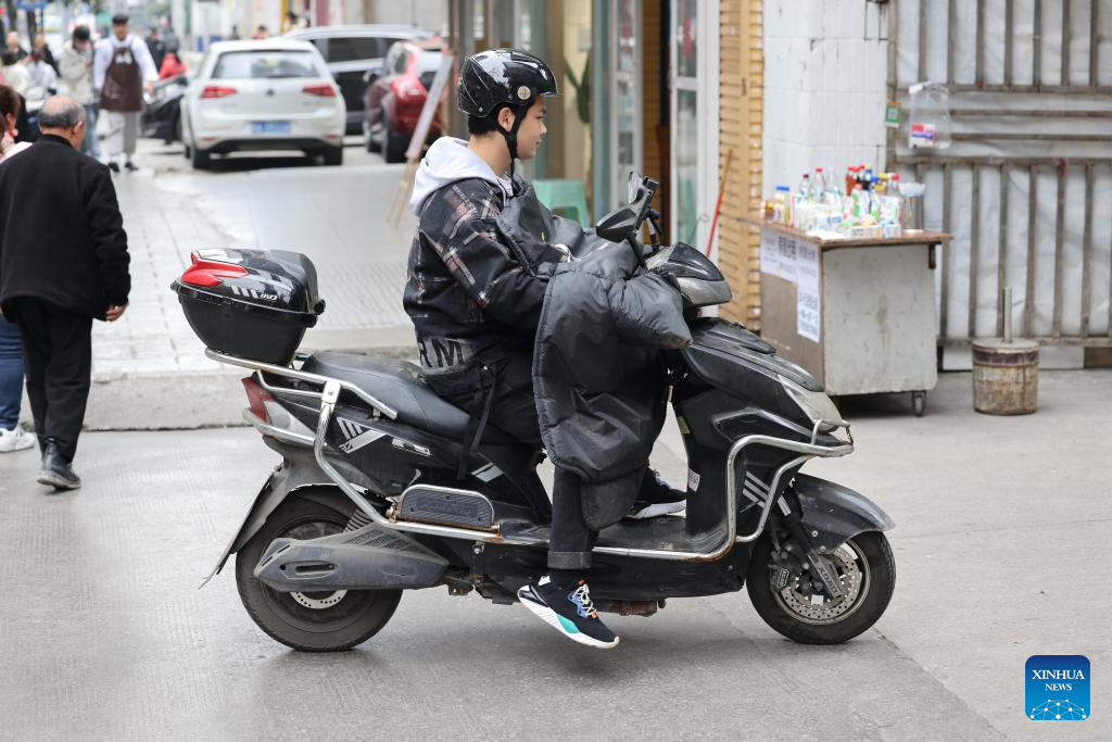 Bassist Peng Wanhai rides for delivery in Guiyang, southwest China's Guizhou Province, March 1, 2022. A band named "Fish Mint" consists of three massage therapists and a delivery man who were all born in the 1990s. Yet the delivery man is the only one who could see while the rest are with visual impairment.