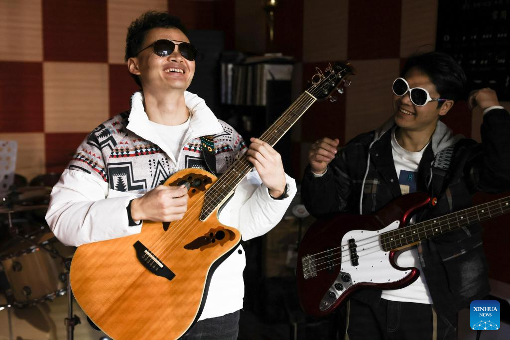 Guitarist Yang Zhi (L) and bassist Peng Wanhai practice in Guiyang, southwest China's Guizhou Province, March 1, 2022. A band named "Fish Mint" consists of three massage therapists and a delivery man who were all born in the 1990s. Yet the delivery man is the only one who could see while the rest are with visual impairment.