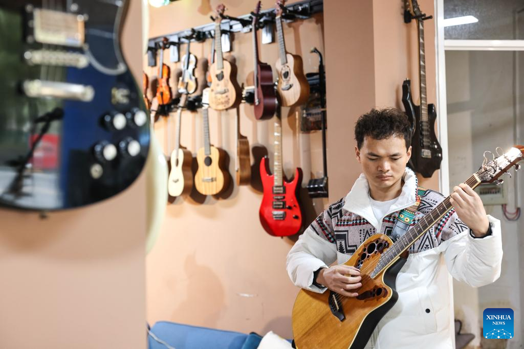 Guitarist Yang Zhi practices in Guiyang, southwest China's Guizhou Province, March 1, 2022. A band named "Fish Mint" consists of three massage therapists and a delivery man who were all born in the 1990s. Yet the delivery man is the only one who could see while the rest are with visual impairment.