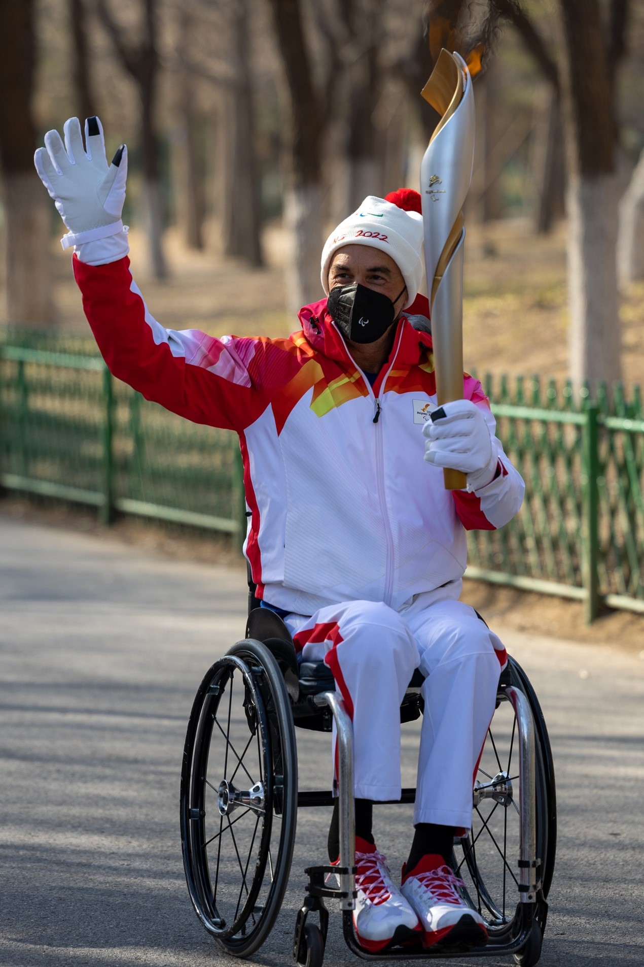 Duane Kale, Vice President of the International Paralympic Committee, holds up the 2022 Winter Paralympics torch. (People’s Daily Online/Weng Qiyu)