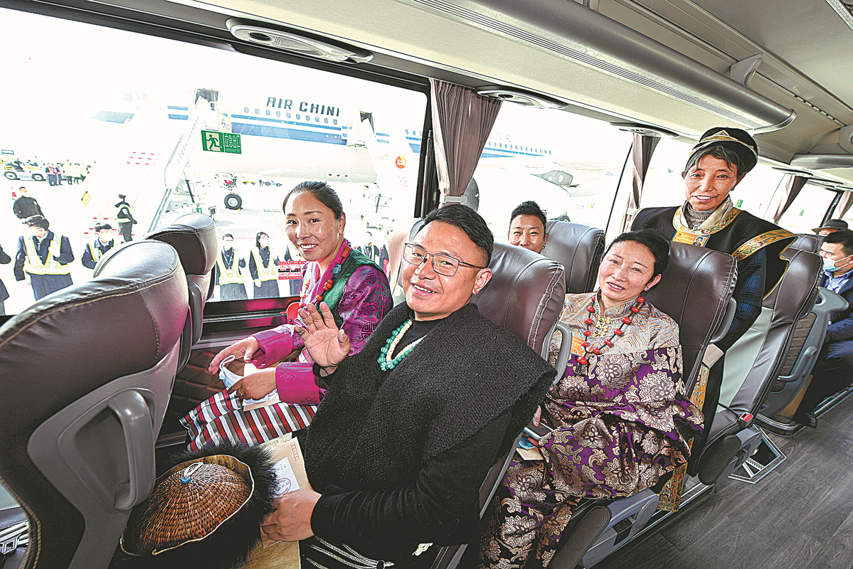 National legislators from the Tibet autonomous region board a bus headed to their accommodation sites on Thursday after arriving in Beijing for the fifth session of the 13th National People's Congress, China's top legislature. Thursday also marked Tibetan New Year. [Photo by Tentsen Shinden/Tibet Daily]