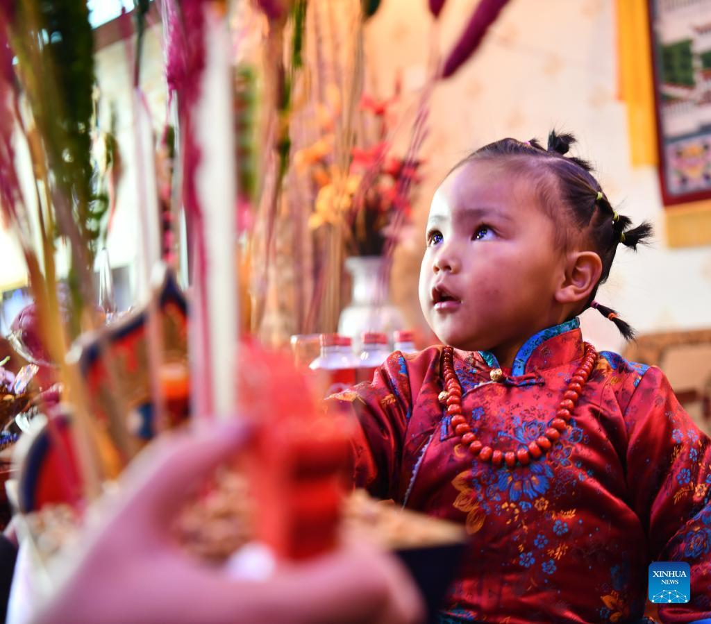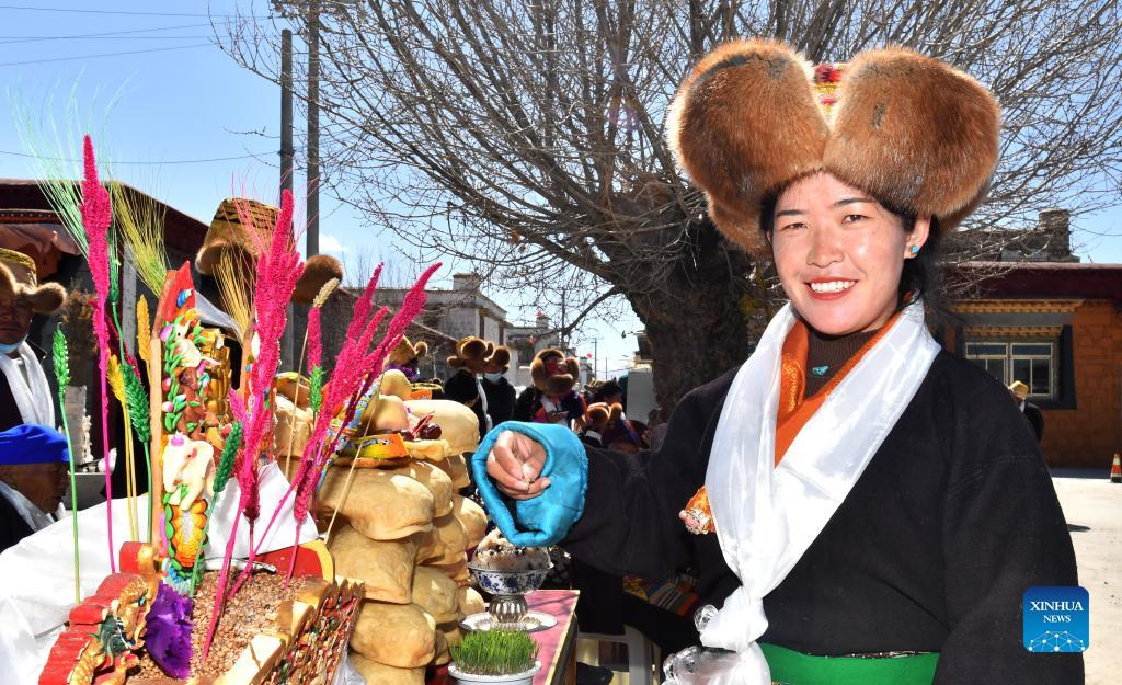 A girl dressed in traditional costumes celebrates the Tibetan New Year in Shannan, southwest China's Tibet Autonomous Region, March 3, 2022. The Tibetan New Year, a traditional festival of the Tibetan ethnic minority, falls on Thursday this year. (Xinhua/Jigme Dorje)
