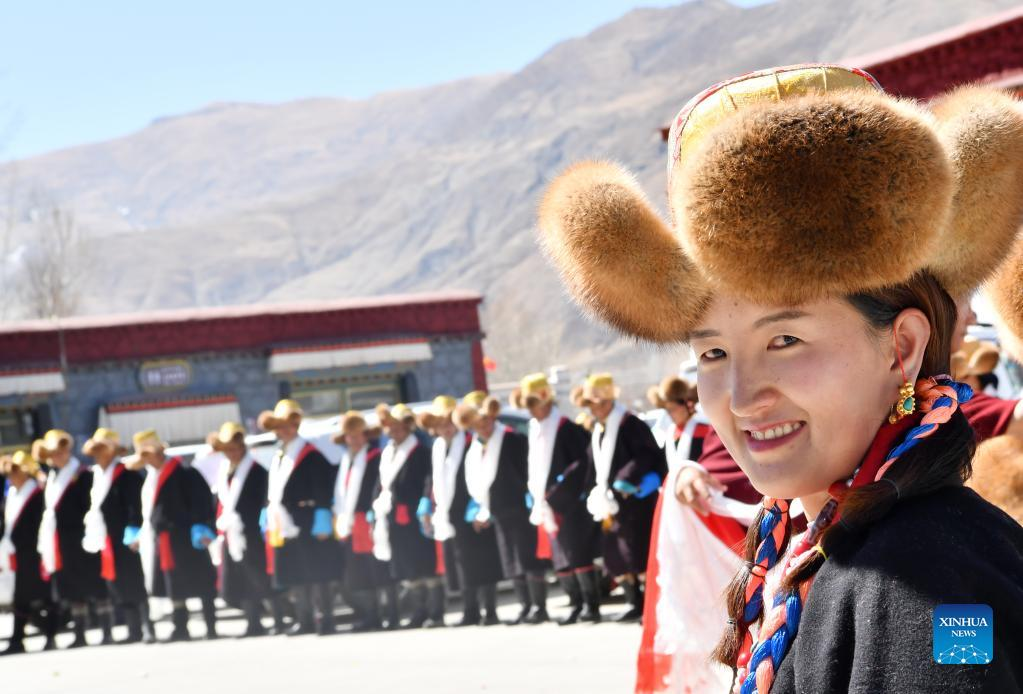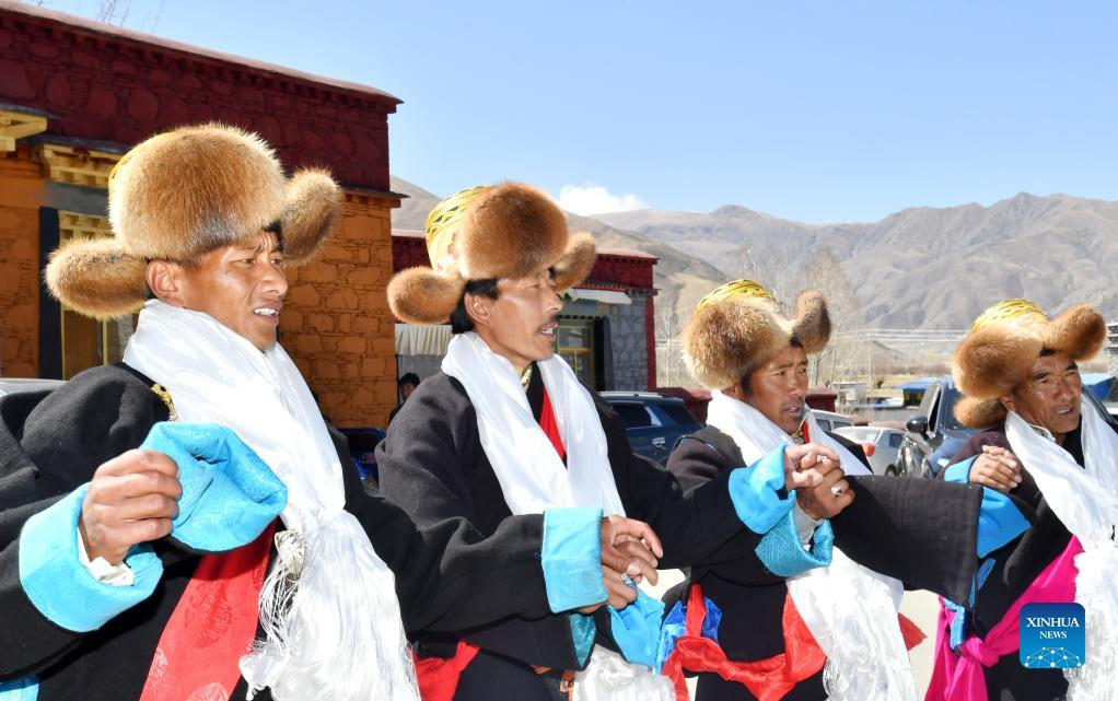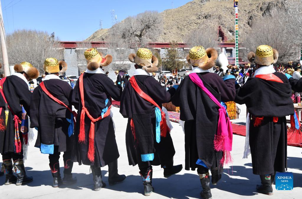 People dressed in traditional costumes celebrate the Tibetan New Year in Shannan, southwest China's Tibet Autonomous Region, March 3, 2022. The Tibetan New Year, a traditional festival of the Tibetan ethnic minority, falls on Thursday this year. (Xinhua/Chogo)