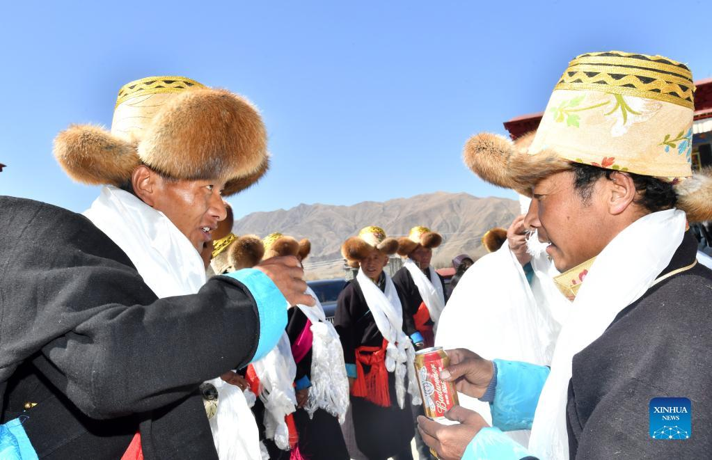People make toasts to celebrate the Tibetan New Year in Shannan, southwest China's Tibet Autonomous Region, March 3, 2022. The Tibetan New Year, a traditional festival of the Tibetan ethnic minority, falls on Thursday this year. (Xinhua/Chogo)