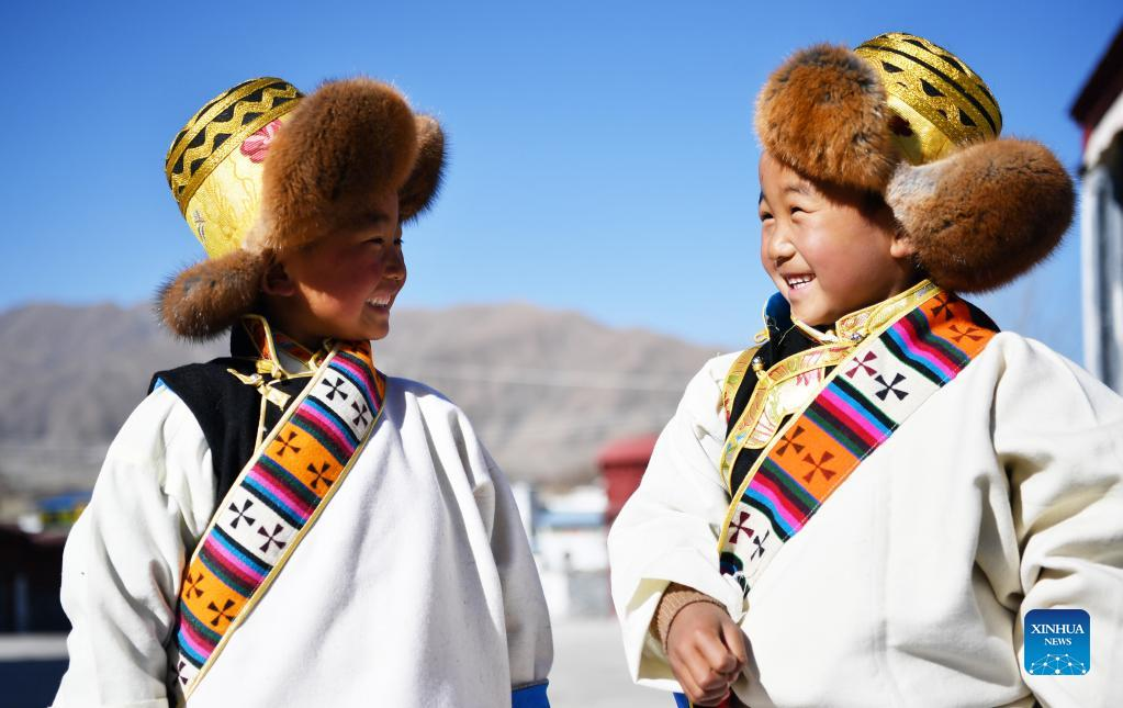 Children dressed in traditional costumes celebrate the Tibetan New Year in Shannan, southwest China's Tibet Autonomous Region, March 3, 2022. The Tibetan New Year, a traditional festival of the Tibetan ethnic minority, falls on Thursday this year. (Xinhua/Chogo)