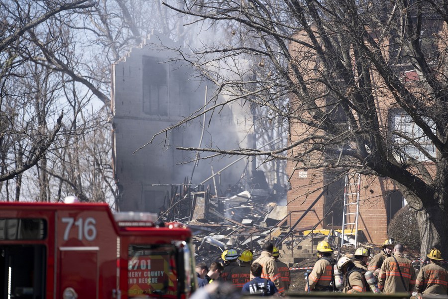 Firefighters work at the scene of an explosion in Silver Spring, Montgomery County, Maryland, the United States, on March 3, 2022. (Xinhua/Liu Jie)