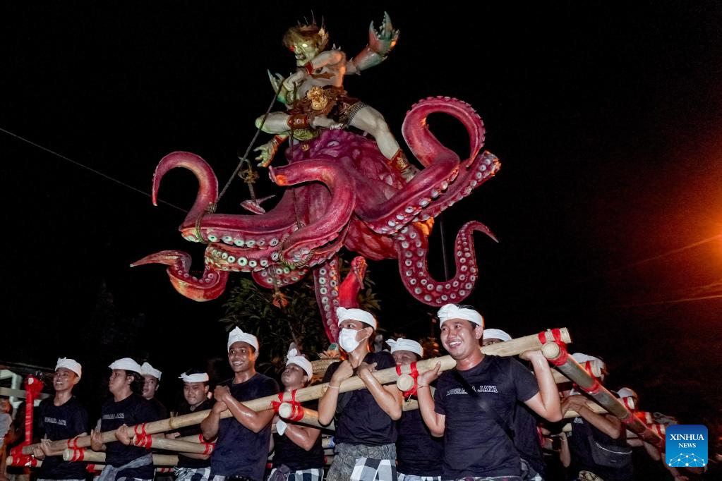 Balinese people carry a giant effigy locally known as "Ogoh-ogoh" ahead of Nyepi day, or the Day of Silence, at Jimbaran village, Bali, Indonesia, March 2, 2022. (Photo by Bisinglasi/Xinhua)