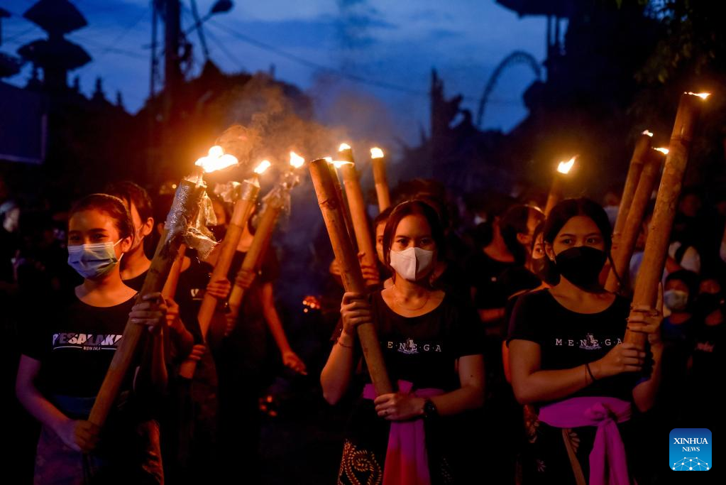 Balinese girls hold torch during a parade ahead of Nyepi day, or the Day of Silence, at Jimbaran village, Bali, Indonesia, March 2, 2022. (Photo by Bisinglasi/Xinhua)