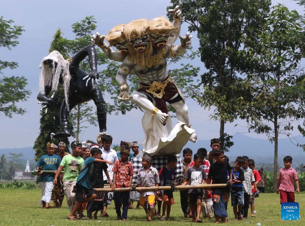 Balinese people carry giant effigies locally known as "Ogoh-ogoh" ahead of Nyepi day, or the Day of Silence, in Malang, East Java, Indonesia, March 2, 2022. (Photo by A. Rochman/Xinhua)