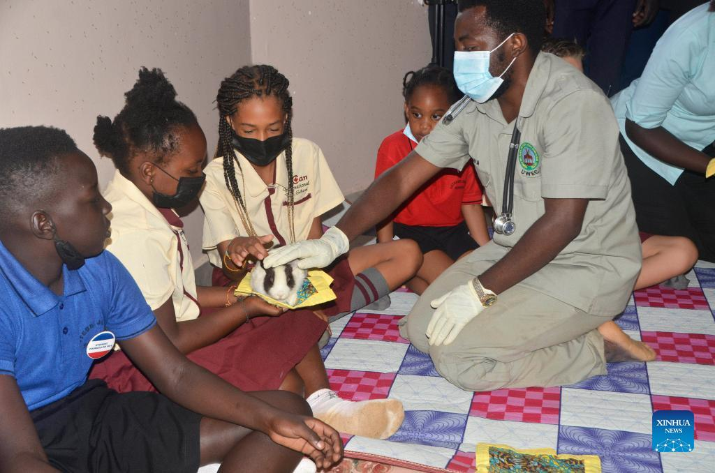 A veterinary health specialist shows ways of handling a rabbit during the World Wildlife Day celebrations at Uganda Wildlife Conservation Education Center in Entebbe, Uganda, on March 3, 2022. (Photo by Nicholas Kajoba/Xinhua)