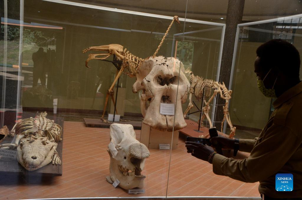 A man takes photos of rhino and elephant skulls during the World Wildlife Day celebrations at Uganda Wildlife Conservation Education Center in Entebbe, Uganda, on March 3, 2022. (Photo by Nicholas Kajoba/Xinhua)