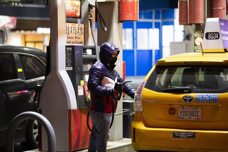 A man refuels a cab at a gas station in New York, the United States, Feb. 25, 2022. (Xinhua/Wang Ying)