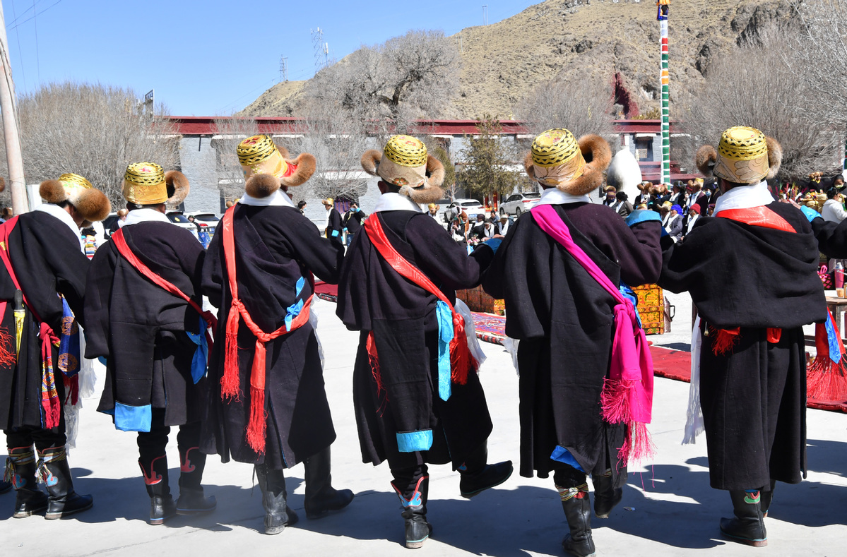 People dressed in traditional costumes celebrate the Tibetan New Year in Shannan, Southwest China's Tibet autonomous region, March 3, 2022. [Photo/Xinhua]