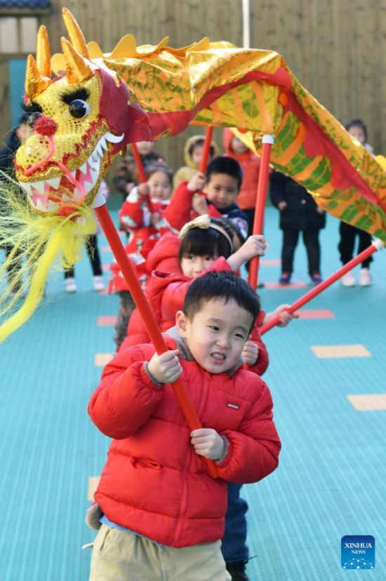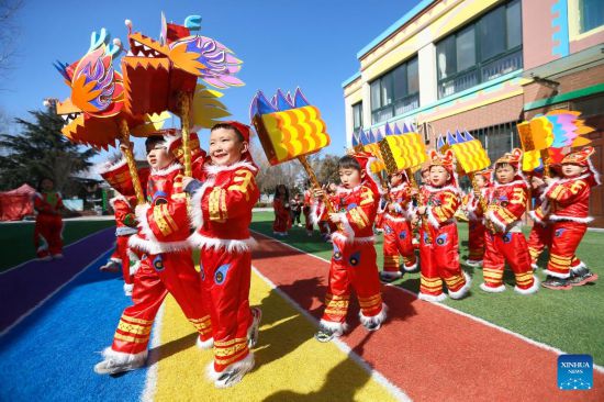 Children perform dragon dance to greet the Longtaitou Day at a kindergarten in Jimo District, Qingdao, east China's Shandong Province, March 3, 2022. Literally meaning "dragon raises head", the day of Longtaitou, the second day of the second lunar month, falls on Friday this year. Various activities were held to greet the day. (Photo by Liang Xiaopeng/Xinhua)