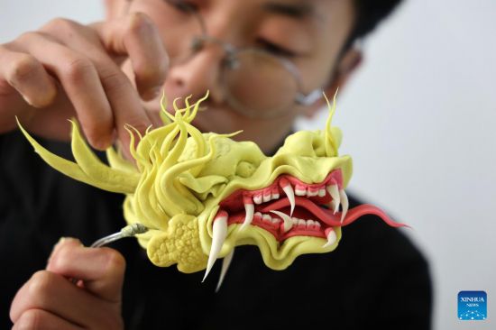 A craftsman makes a dough sculpture to greet the Longtaitou Day in Qinghe Township of Huimin County, Binzhou City, east China's Shandong Province, March 3, 2022. Literally meaning "dragon raises head", the day of Longtaitou, the second day of the second lunar month, falls on Friday this year. Various activities were held to greet the day. (Xinhua/Chu Baorui)