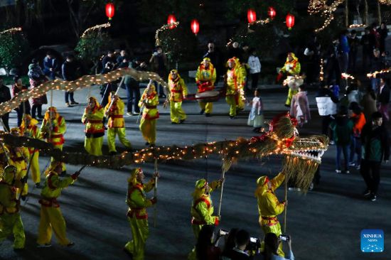 Villagers perform dragon dance to greet the Longtaitou Day in Huizhou District of Huangshan, east China's Anhui Province, March 2, 2022. Literally meaning "dragon raises head", the day of Longtaitou, the second day of the second lunar month, falls on Friday this year. Various activities were held to greet the day. (Photo by Shi Yalei/Xinhua)