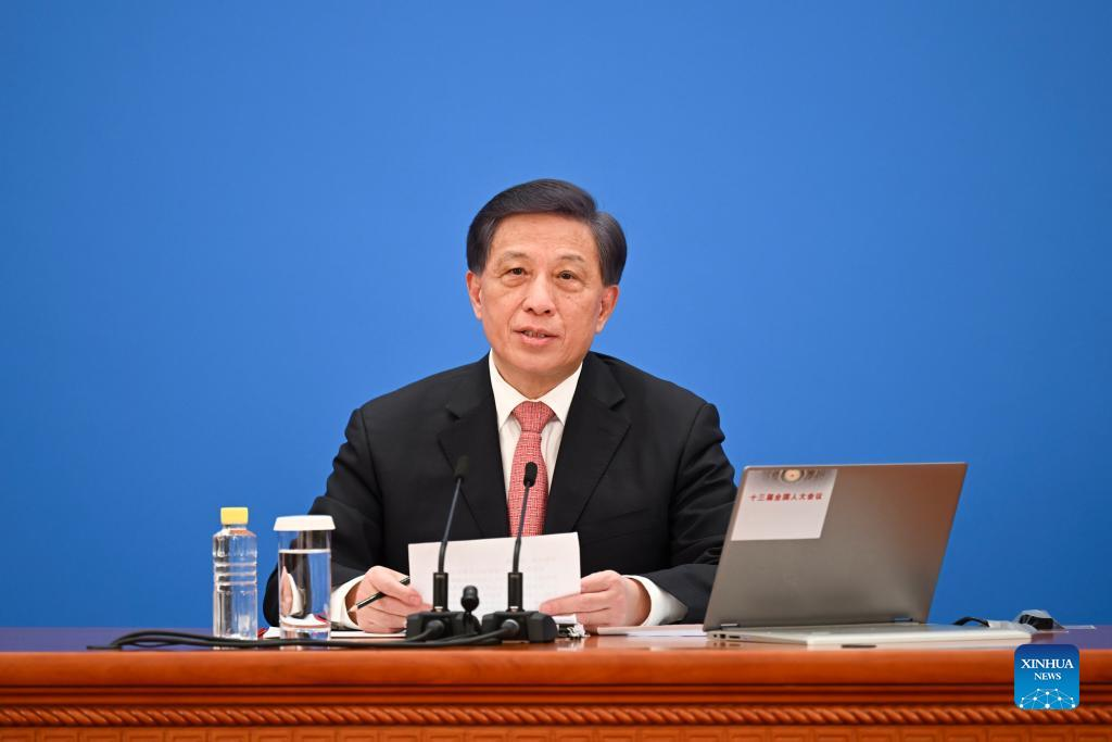 Zhang Yesui, spokesperson for the fifth session of the 13th National People's Congress (NPC), speaks during a press conference via video link in Beijing, capital of China, March 4, 2022. The press conference of the session was held via video link due to COVID-19 prevention and control requirements. Zhang took questions from media on the agenda of the session and the work of the people's congresses. (Xinhua/Chen Yehua)