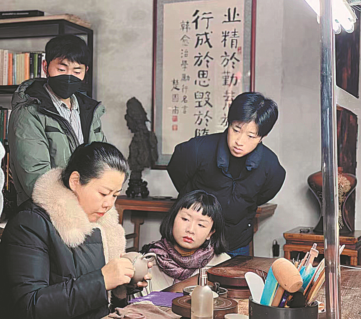 Apprentices watch Tian making a teapot at the center. CHINA DAILY