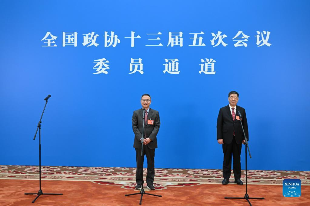 Members of the 13th National Committee of the Chinese People's Political Consultative Conference (CPPCC) are interviewed via video link ahead of the opening of the fifth session of the 13th CPPCC National Committee at the Great Hall of the People in Beijing, capital of China, March 4, 2022. (Xinhua/Jin Liangkuai)