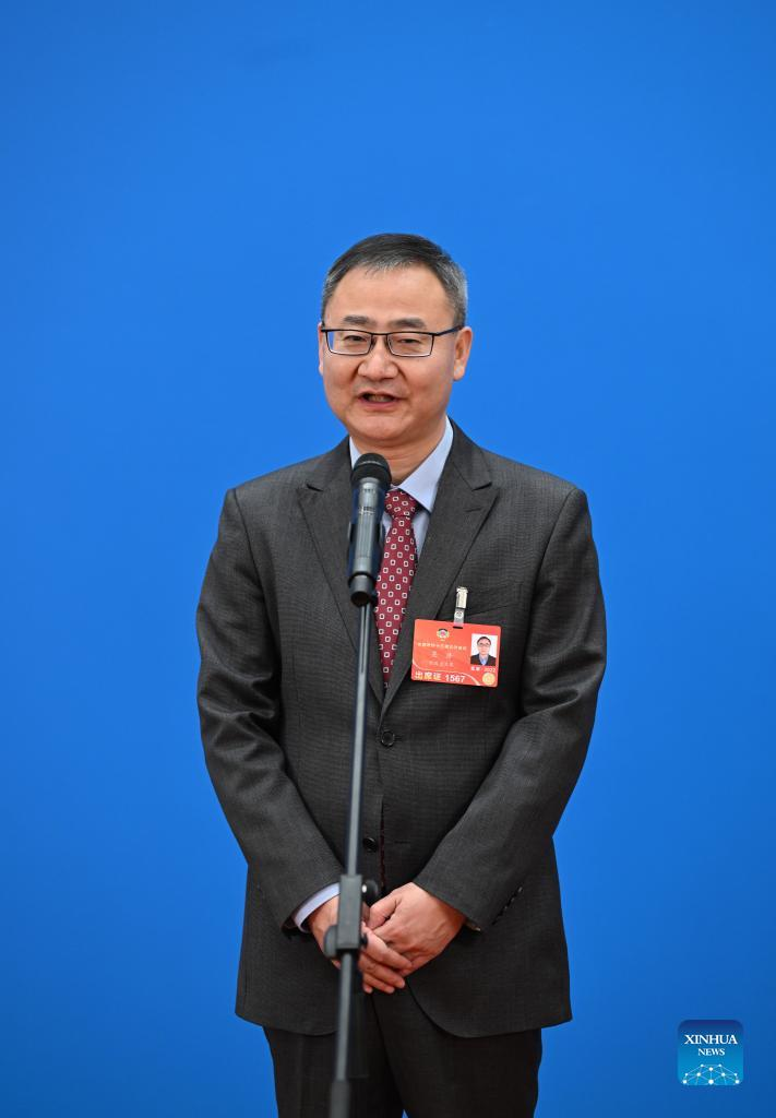 Wu Hao, a member of the 13th National Committee of the Chinese People's Political Consultative Conference (CPPCC), is interviewed via video link ahead of the opening of the fifth session of the 13th CPPCC National Committee at the Great Hall of the People in Beijing, capital of China, March 4, 2022. (Xinhua/Jin Liangkuai)