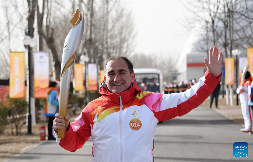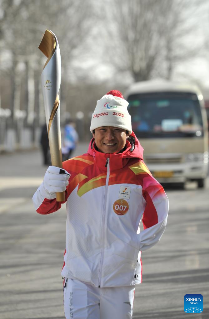 Torchbearer Lu Haiming attends the Beijing 2022 Paralymic Torch Relay in Beijing, capital of China, March 4, 2022. (Xinhua/Li Xin)
