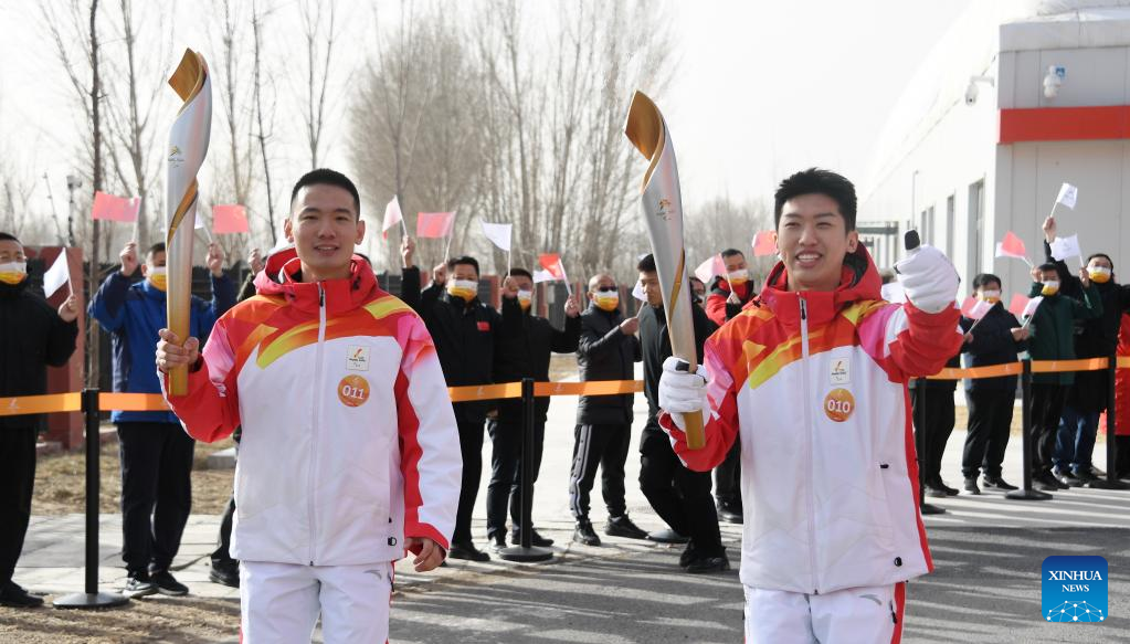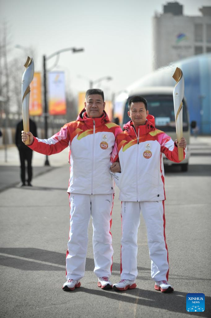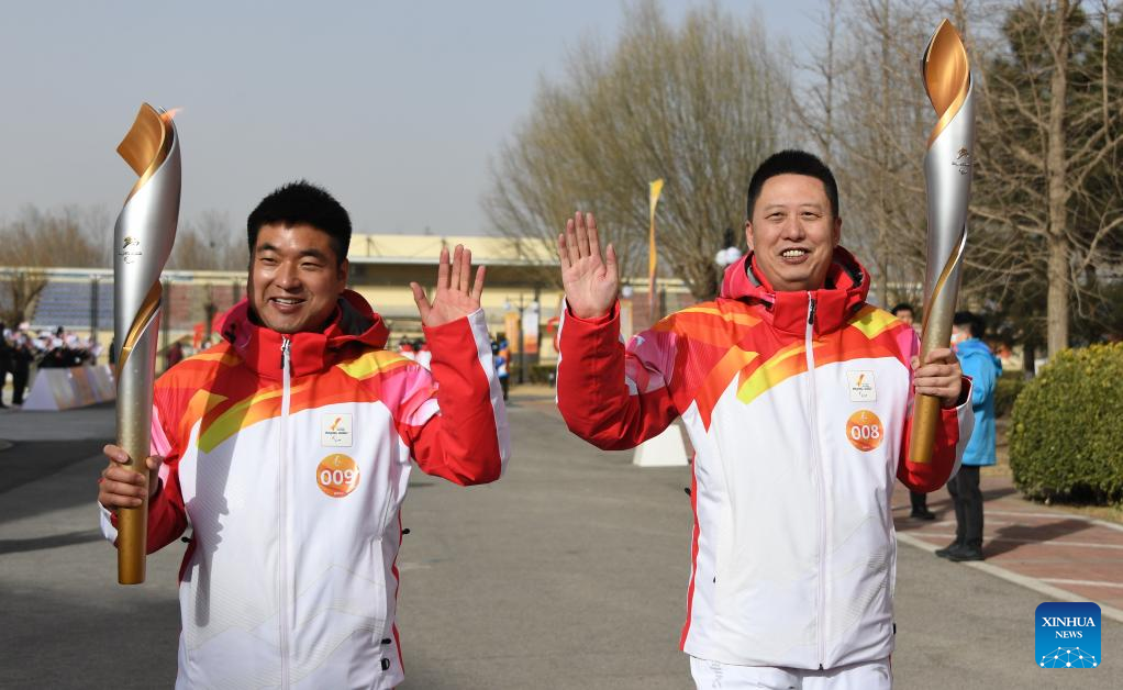 Torchbearers Ren Gaoqi (L) and Zhou Hongfei attend the Beijing 2022 Paralymic Torch Relay in Beijing, capital of China, March 4, 2022. (Xinhua/Li Xin)