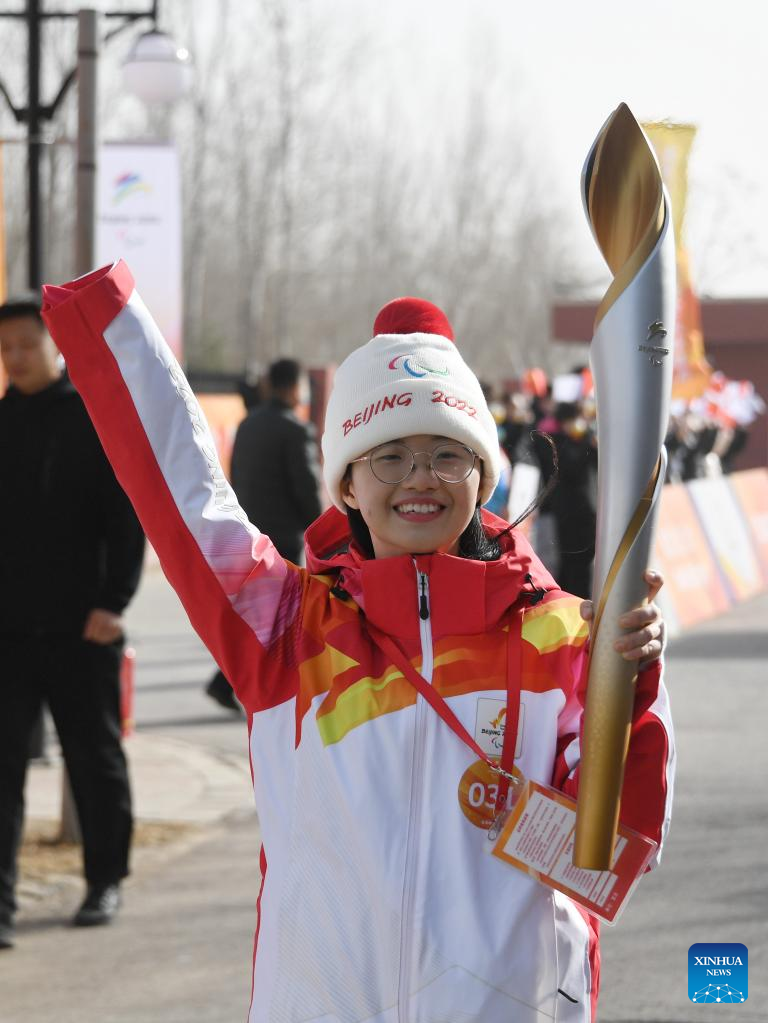 Torchbearer Yu Ruoan attends the Beijing 2022 Paralymic Torch Relay in Beijing, capital of China, March 4, 2022. (Xinhua/Li Xin)