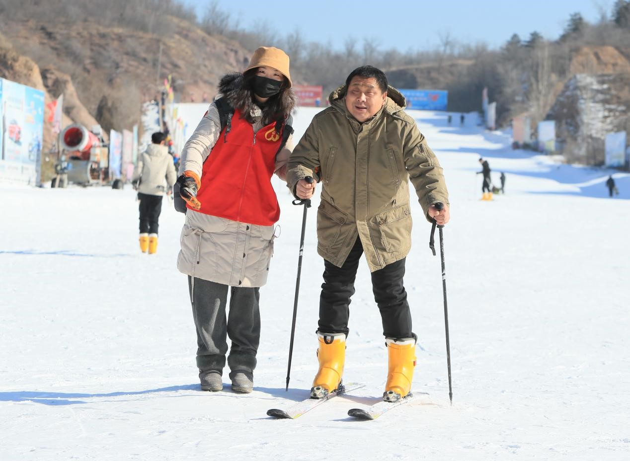 A person with disabilities learns to ski with the help of a volunteer in Chaoyang city, northeast China’s Liaoning province, Jan. 20, 2022. (Photo by Qiu Yijun/People’s Daily Online)